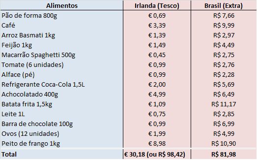 Temos diversas opções de mercados pela Irlanda, mas para fazer a comparação escolhemos o Tesco, reduto incansável de intercambistas brasileiros e que, nos produtos analisados, possui preços bem similares ao do Lidl e Aldi. Já para o Brasil, selecionamos o Extra, que também trabalha com preços mais acessíveis.
