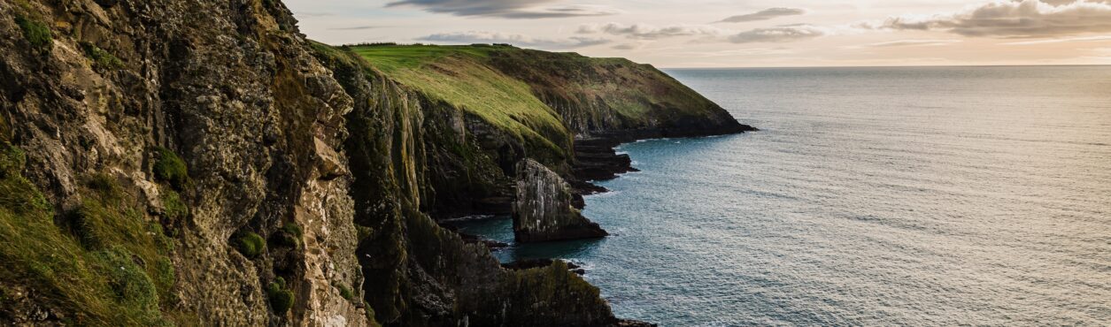 Scenic view of the Wild Atlantic Way in Ireland near Kinsale with green hills at sunset.